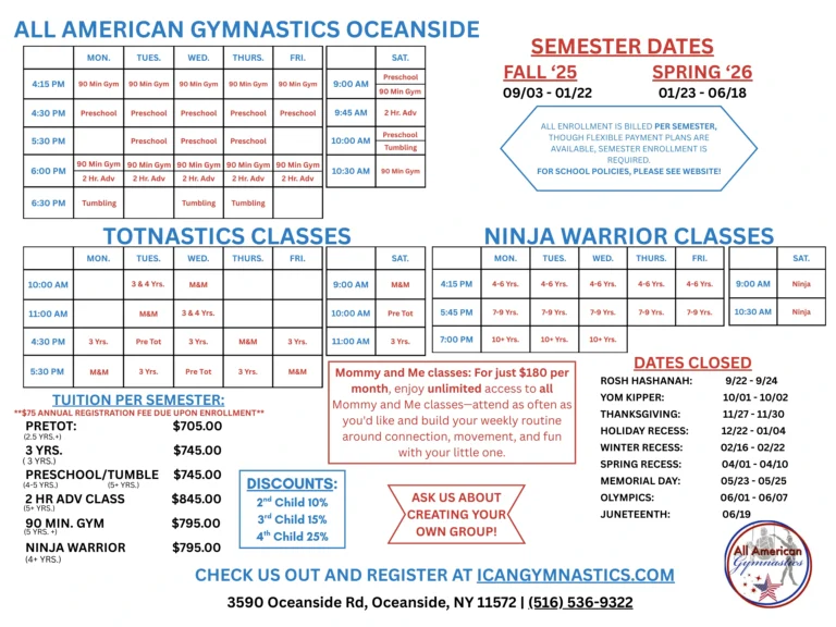 Bond with your little one while introducing them to the joy of movement! Our 50-minute parent-child class focuses on nurturing early development and encouraging exploration as you navigate age-appropriate gymnastics equipment together. Foster early motor skills, social interaction, and the development of proprioceptive, kinesthetic, and vestibular senses, all under the guidance of our qualified coaches.